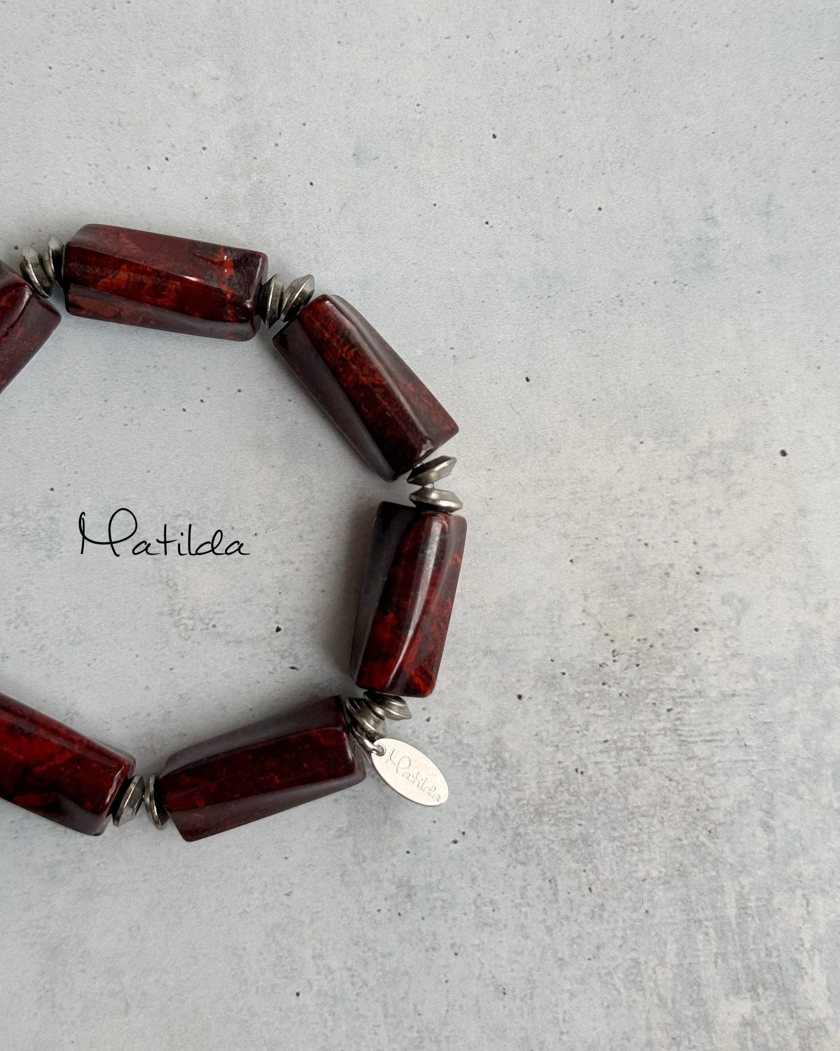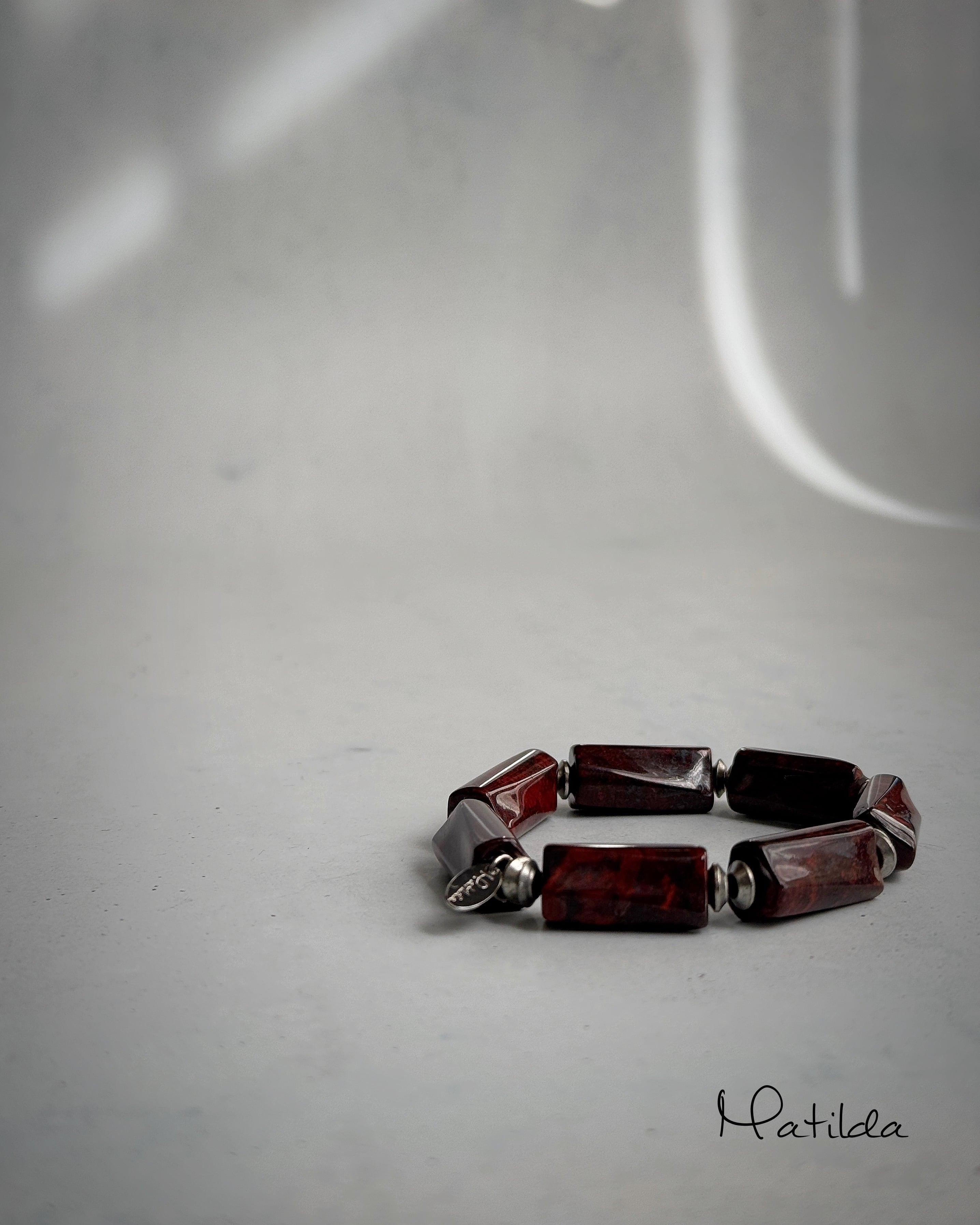 落ち着いた飴色と奥行きのあるダークなレッドブラウンが混じり合うジャスパーに、ひやりと冷たい質感のシルバービーズをペアリング。