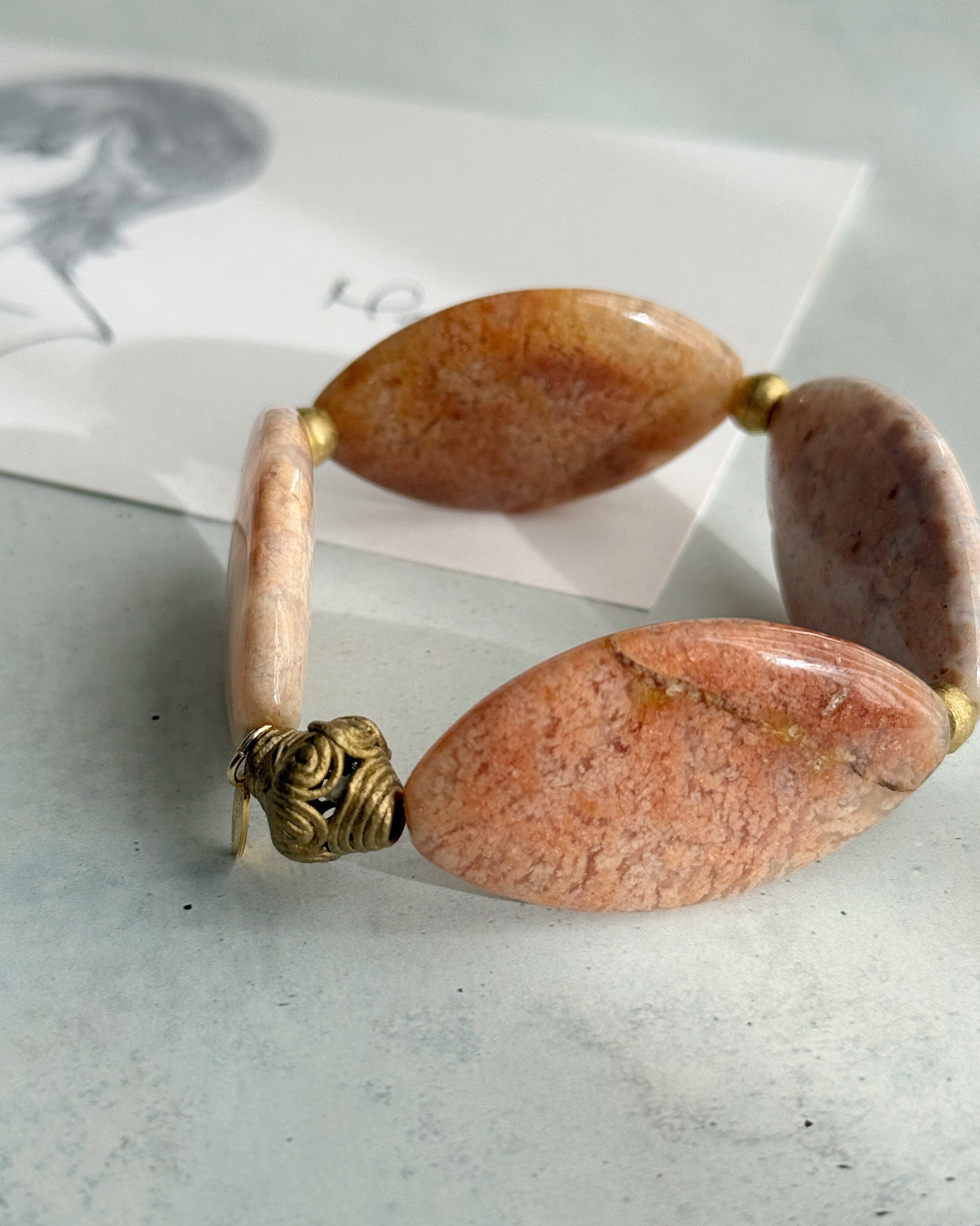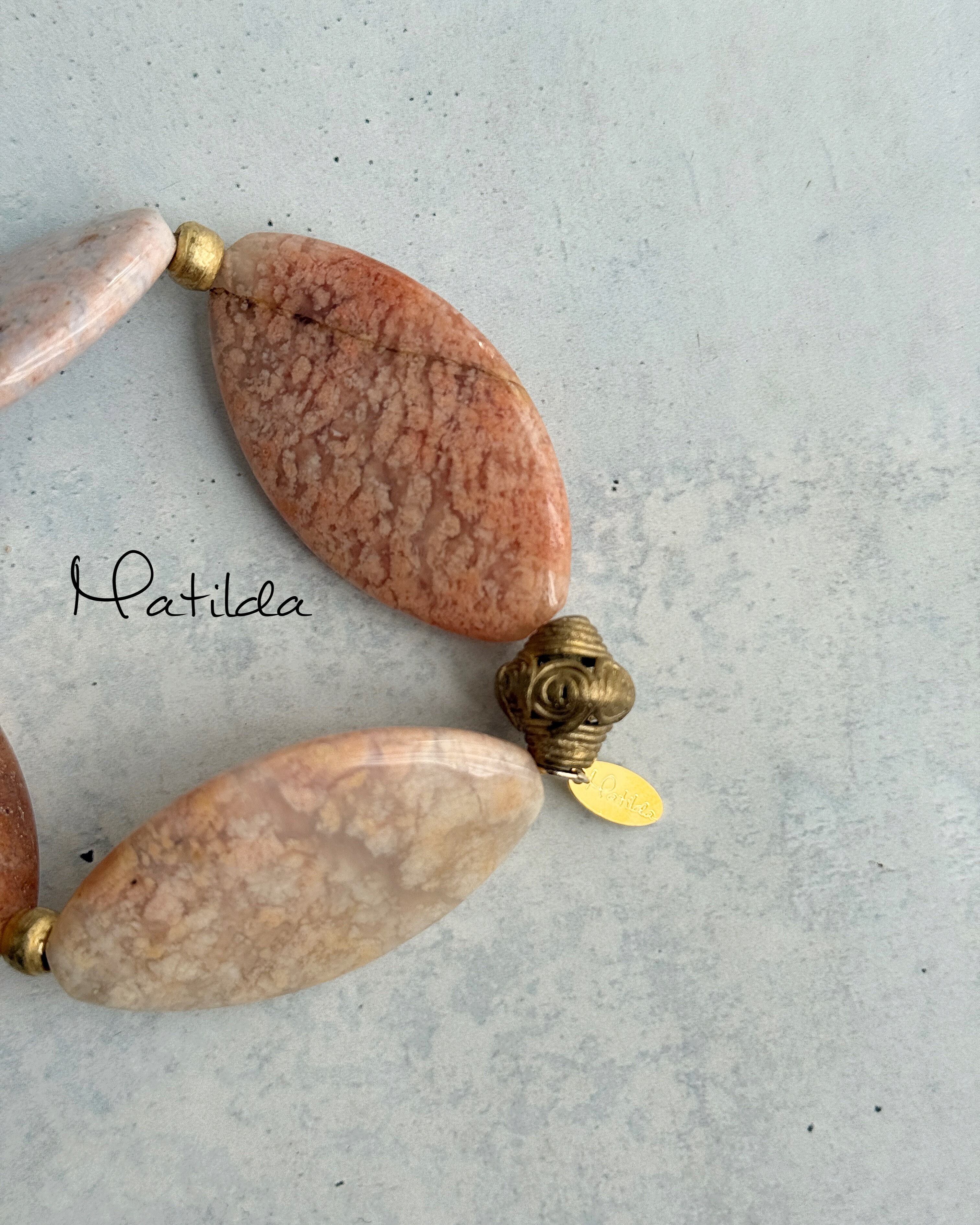 大胆なサイズ感が強烈なインパクトを残すピンクアゲートを、暖かみのある真鍮ビーズとペアリング。