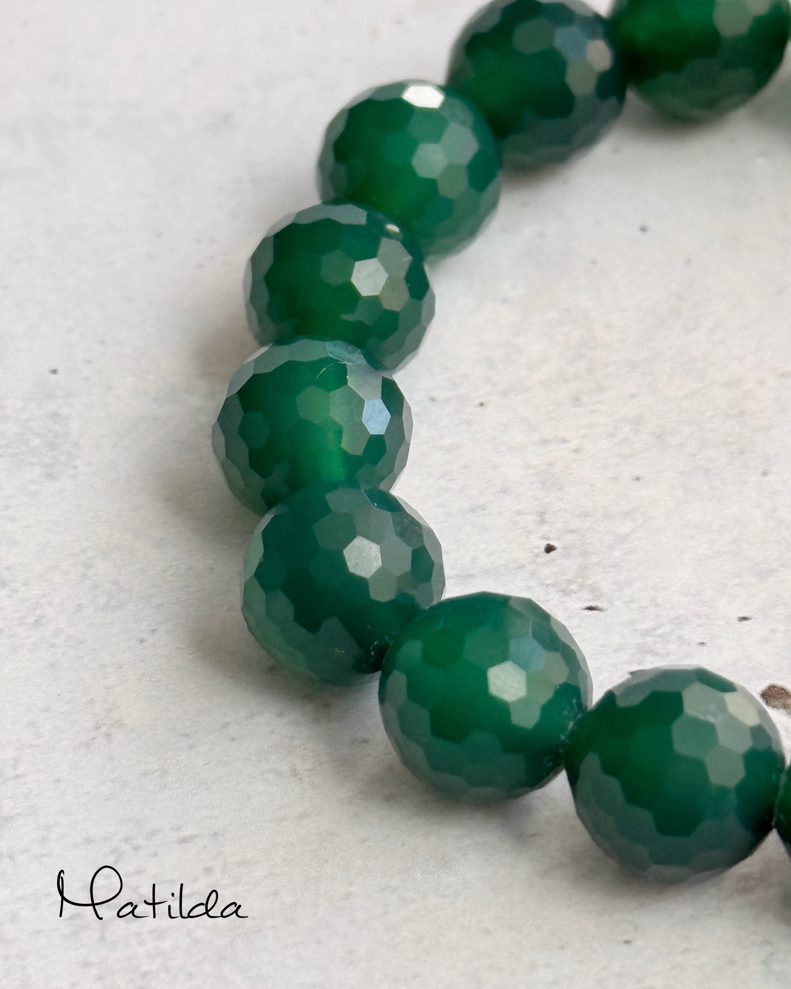 ミルキーホワイトとブルーグリーンの繊細なマーブルがフェミニンなクリソコラのタブレットにアンティークゴールドの真鍮ビーズを合わせ、透明感のあるフォレストグリーンに多面カットを施したどこかノスタルジックなグリーンオニキスをペアリング。